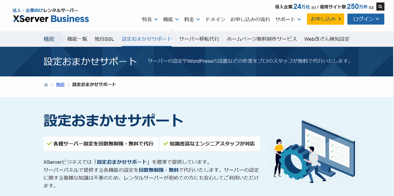 エックスサーバービジネスでは、設定代行サービス以外にも充実したサポート体制が整っています。